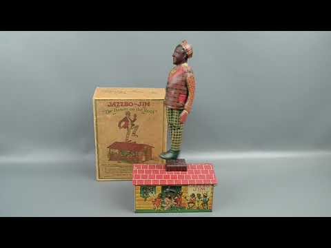 This toy is in excellent condition with bright colorful litho showing some light wear around moving joints. Tested and works very well, occasionally the bar needs a little pull to get moving. Box shows some very light edge wear and minor discoloration.